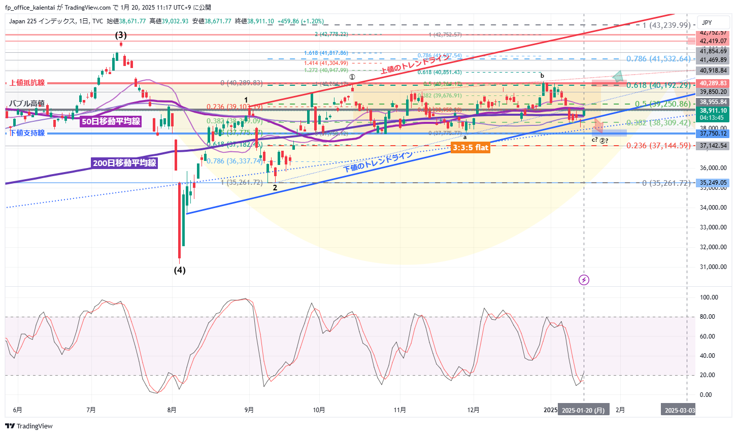 つまり、「4万200円付近の上値抵抗線を抜けるまでは、レンジ相場が続く可能性が高い」と判断します。