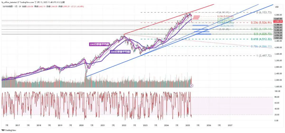 例えばシナリオとしては、S&P500の場合、2025年2月高値を「天井」と捉え、それ以降の動きは下落波動を描く可能性が高いと考えます。そうすることで、どこまで下がるかを意識することができます。そのため、前述のフィボナッチ・リトレースメントなどの分析ツールを用い、下値を探っていきます。