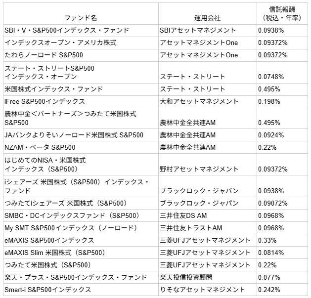 S&P500対象商品の信託報酬比較