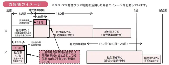 両親がそれぞれ14日以上育休を取得すれば、給付率が67%から13%分上乗せされて80%になります。税金や社会保険料がかからないため、手取りで10割相当になります。