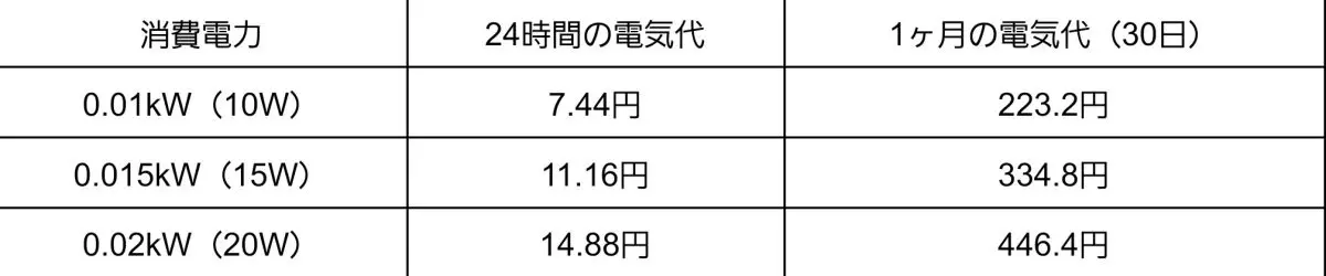 料金単価は全国家庭電気製品公正取引協議会が定めている、電力料金目安単価の31円/キロワットアワーを用いて計算します。ワット数ごとの電気代を算出した結果は図表1の通りです。