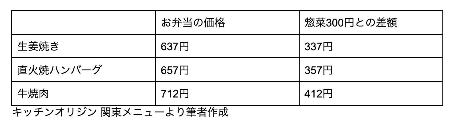 イオングループのキッチンオリジンでお弁当を買ったときと、スーパーでお惣菜300円を買ったときの価格差は、図表2のようになります。