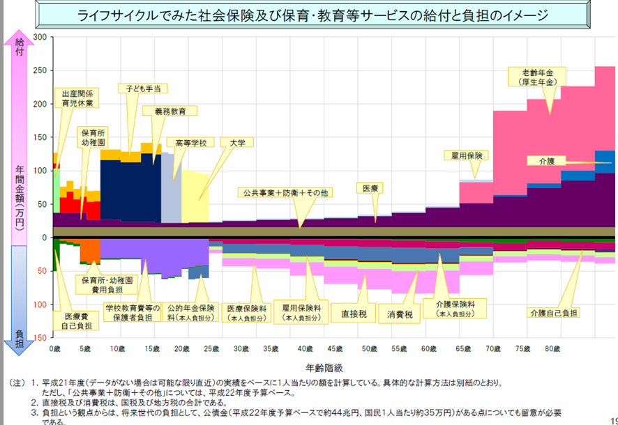 全体的に見ると、0歳から20歳までと65歳以降の時期に、社会保険からの給付を受ける機会が多くなること、20歳から65歳までの現役世代が主に保険料を負担していることが分かります。