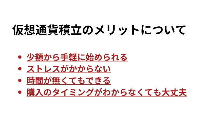 仮想通貨の積立投資をするメリットは次の4つです。