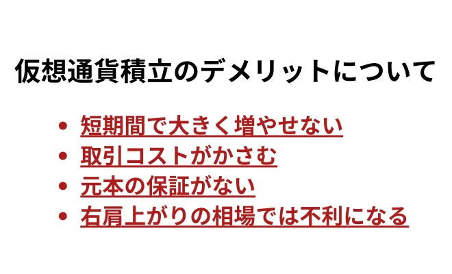 ここからは、仮想通貨の積立投資のデメリットを紹介します。