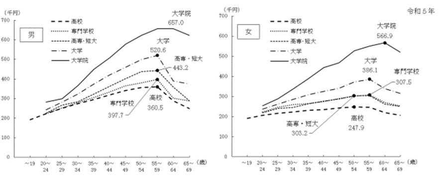 それでは、年収500万円を目指すにはどのような進路がよいのでしょうか。厚生労働省「令和5年基本構造基本統計調査」によると、学歴、性別、年齢階級別の賃金は図表1のような結果になっています。