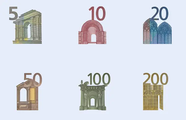 2つのシリーズとも、紙幣の表面には窓や門、裏面には橋が描かれており、これらは国を超えて協力し合うヨーロッパの姿勢や、外の世界へ開かれた精神を象徴するモチーフです。