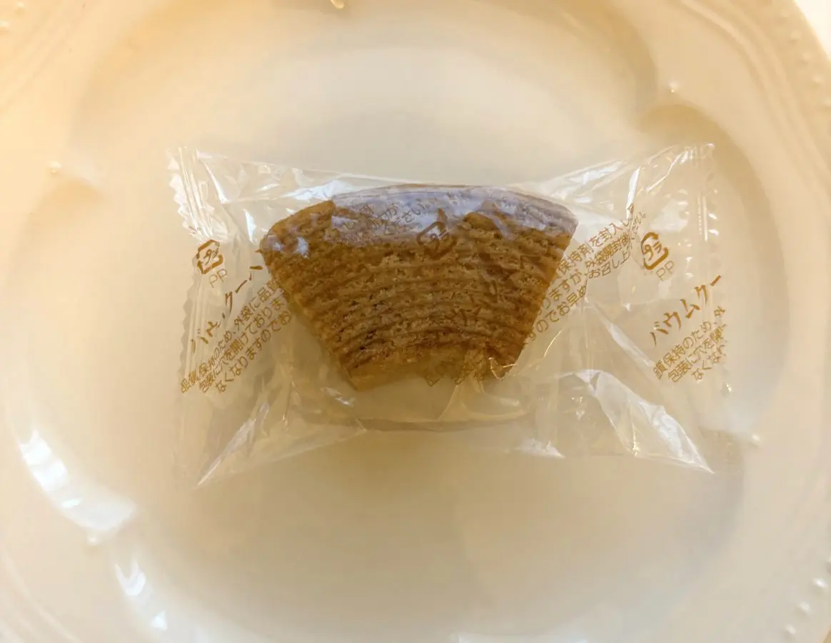 最後に味わったのは、「森永ミルクキャラメル バウムクーヘン」。個包装スタイルで、厚みのある扇形のバウムクーヘンが目を引きます。
