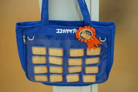 「ココナッツサブレ」の缶バッジ16個と、キャラクターをデザインしたリボン付きバッジがセットになったサブレ愛全開のバッグ。色は4色から選択可能。