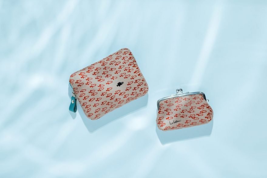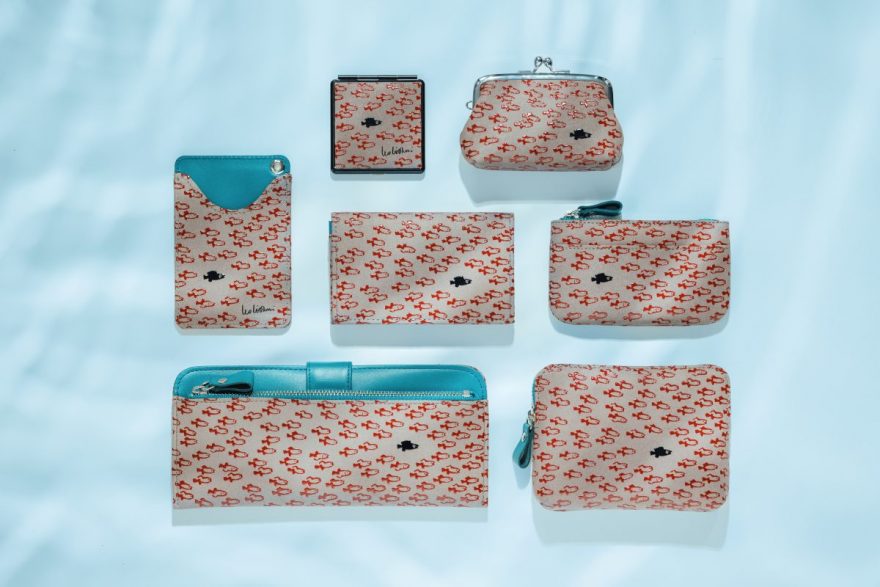 「印伝」とは、鹿革に漆で模様を施した日本伝統の革工芸であり、「甲州印伝」は経済産業省にも認定されている工芸品です。今回のコレクションでは、絵本『スイミー』に登場する赤い小魚たちと黒いスイミーを、漆のあでやかな質感と立体感を生かして繊細に描いています。