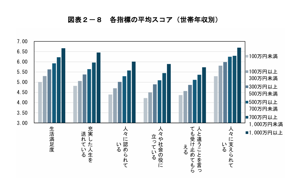 図表1は、内閣府による「生活満足度調査」の世帯年収別平均スコアの比較のグラフです。これを見ると、世帯年収が高いほど満足度は上がる傾向にあることが分かります。