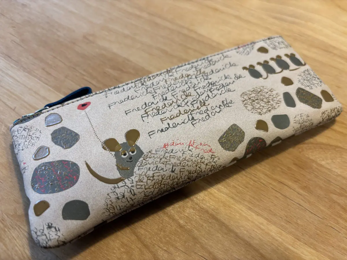 今回、先行して触ってみたのは「特F小銭入02[Beige×Frederick]」と「ペンケースC[Beige×Frederick]」の2つです。ベージュの鹿革に高級感が漂い、大人でも使えそう印象。印伝は柄が主役になりやすいのに、色味が控えめで、フレデリックの世界観がふっと浮かび上がるようです。
