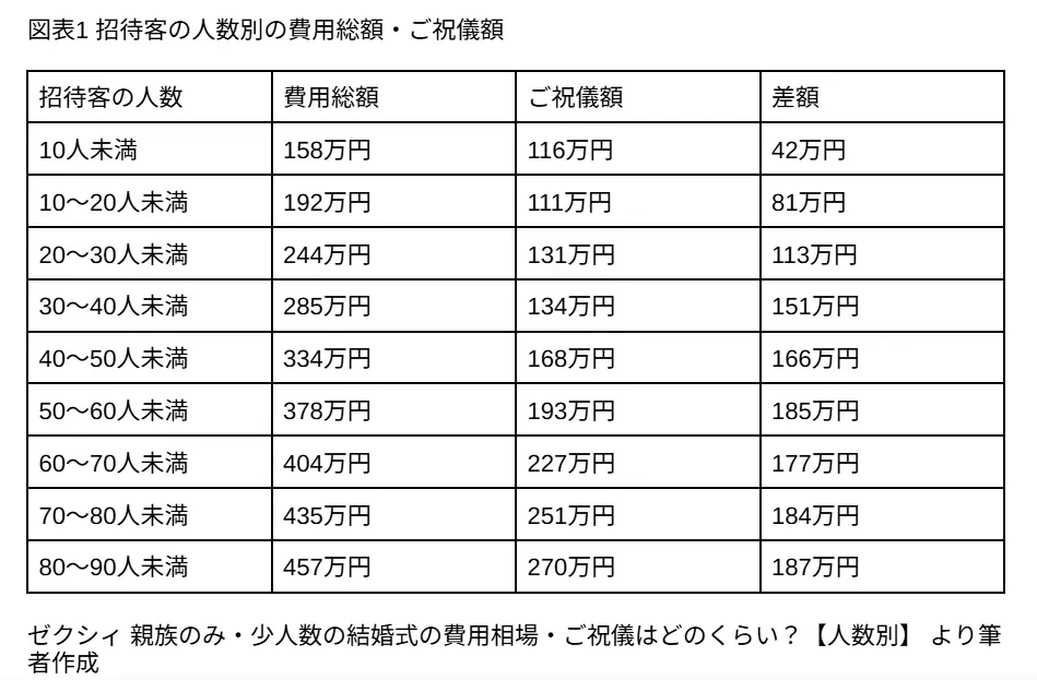 続いて、招待客の規模別に費用総額・ご祝儀額をみていきましょう(図表1)。