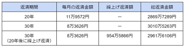 図表1の通り、2600万円を20年間で返済した場合、20年間の総返済金額は約2870万円です。一方で、2600万円を返済期間30年で完済しようとすると、毎月の返済金額はおよそ8万円で、総返済金額は約3010万円となります。また、20年後に繰上げ返済した場合、返済金額は約2962万円となるので、20年間で返済するよりも100万円ほど返済金額が多くなる見込みです。