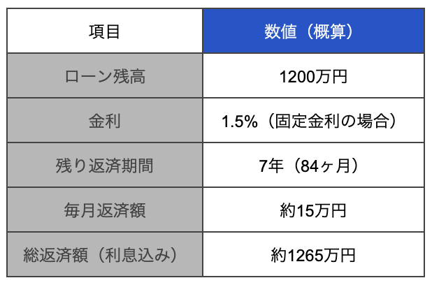 ローン残高1200万円を残り7年(84ヶ月)で返済(元利均等)する場合、金利1.5%と仮定すると、支払いイメージは図表1のようになります。