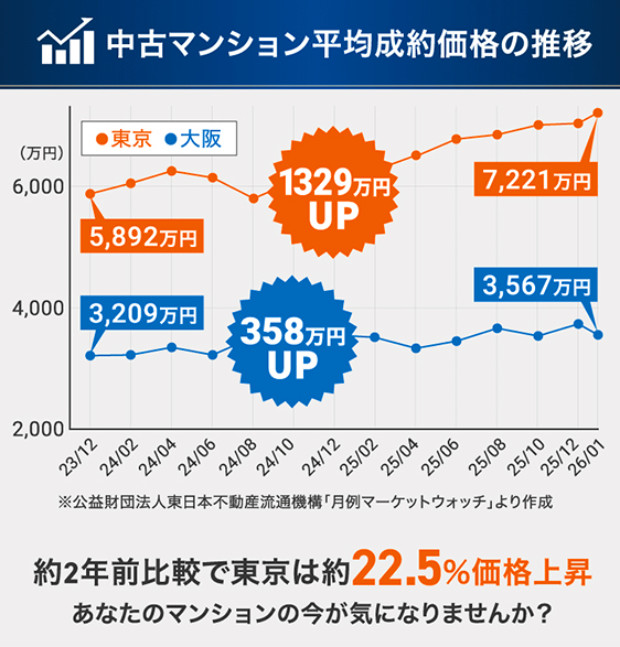実際に、2023年と比較して2026年1月時点では、東京では平均で約1329万円、大阪でも約358万円の上昇が見られています。