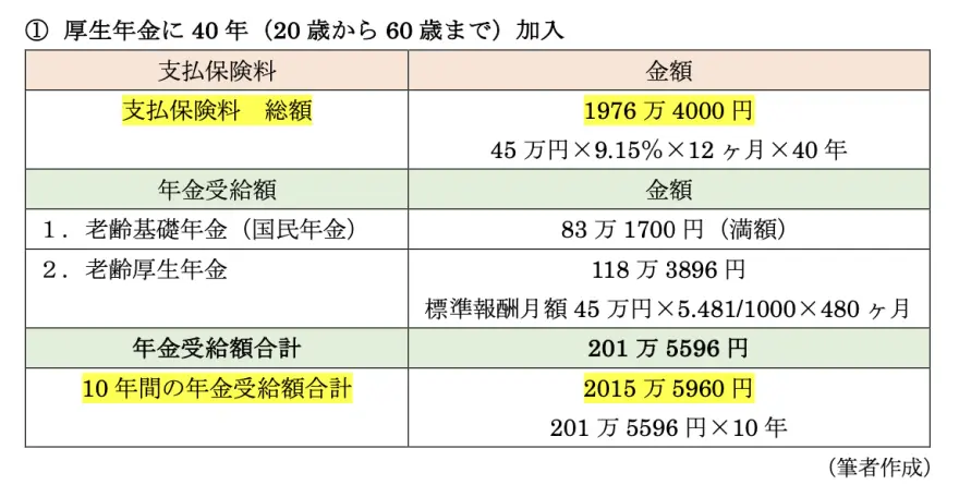 厚生年金の受給額は、保険料納付期間と納付金額に比例するので、人によって異なり満額という概念はありません。厚生年金は保険料を長く払えばその分年金額も増えますが、何年以上受給すると支払保険料を上回るのか2つのパターンで試算してみましょう。
