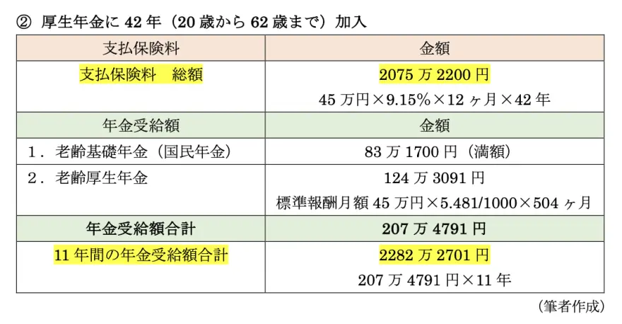 図表3のとおり、42年間保険料を納めた場合、11年間年金を受給すると支払保険料の総額を上回ります。加入期間中の収入と保険料の納付期間で、損益分岐点は異なります。