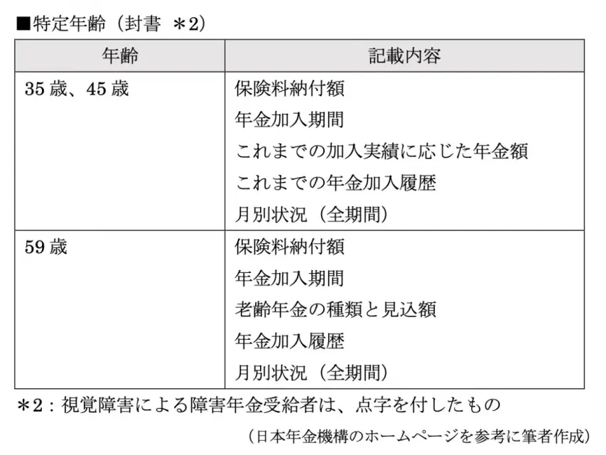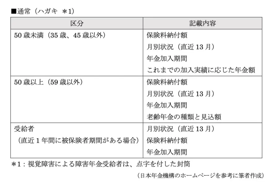 「ねんきん定期便」は、年齢によって形式や記載内容が図表1のように異なります。通常ははがきが、特定年齢時には封書が送られます。50歳以上の人は定期便を受け取ったときと同様のペースで保険料を納めた場合に、65歳から受け取れるおおよその年金額が記載されています。