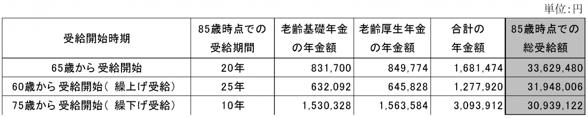 厚生労働省「簡易生命表(令和5年)」によると、2023(令和5)年の日本人の平均寿命は男性が81.09歳、女性が87.14歳前提となっています。仮に、平均年齢に近い85歳時点を想定して、繰上げや繰下げ受給をした場合なども考え、総受給額を比較したものが図表1です。