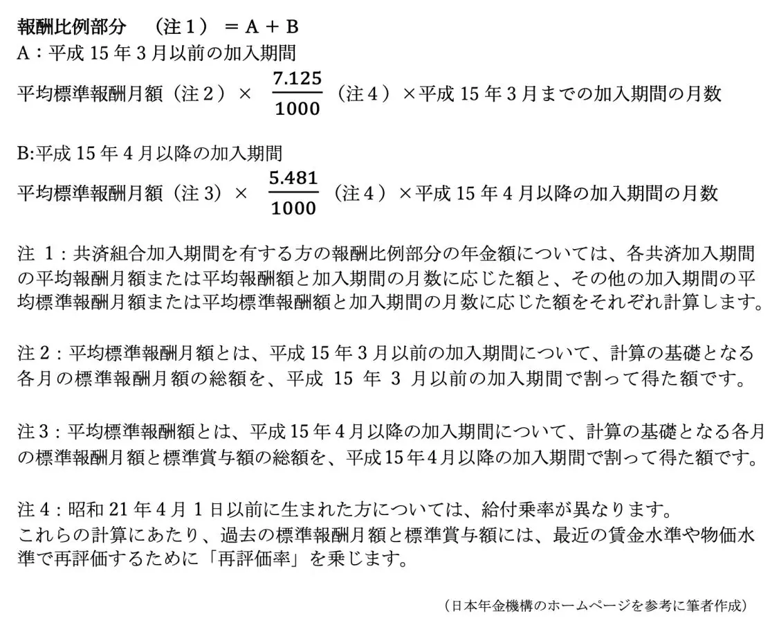 報酬比例部分の年金額は、加入期間や過去の報酬等に応じて決まり、以下の式で計算されます。